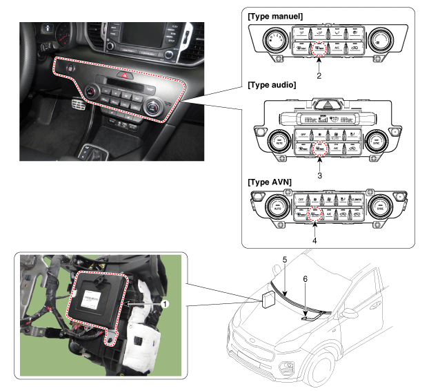 4. Interrupteur du dégivreur de pare-brise (type AVN) 5. Dégivreur de pare-brise 6. Connecteur du dégivreur |