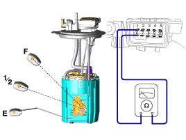 flotteur se déplace de "E" (vide) à "F" (plein).