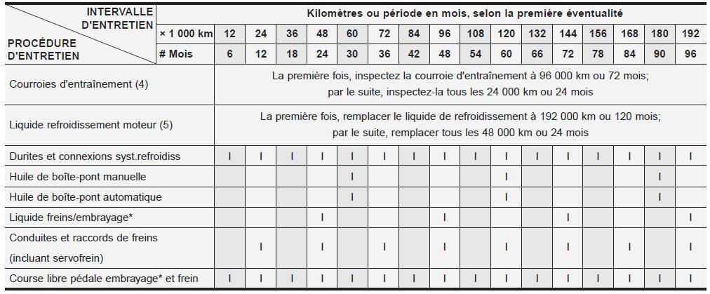 Les services d'entretien suivants doivent être exécutés pour assurer un bon contrôle des émissions et une bonne performance. Conservez vos factures pour tous les travaux sur le système antipollution du véhicule aux fins de la garantie. Quand le kilométrage et la durée sont affichés, la fréquence de service est établie selon la première occurence.